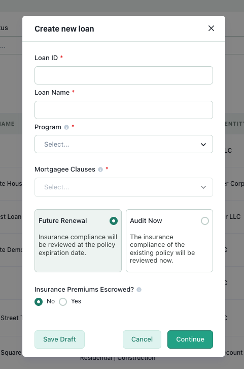 In the context of creating/onboarding a new post-close loan onto the platform, we have replaced the question "Is this a Pre-approved loan?" with the following two options: Future Renewal and Audit Now