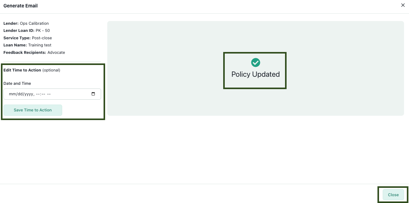• A Close button has been added to the bottom right corner to finalize the email generation process and update the Policy to the Next Action.
