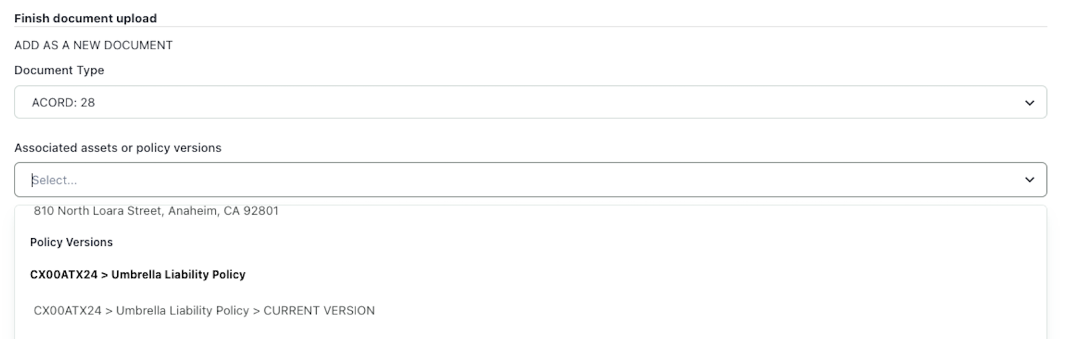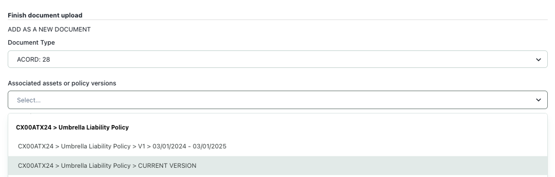 Any newly uploaded or merged document associated with that policy will align with the "Current Version."