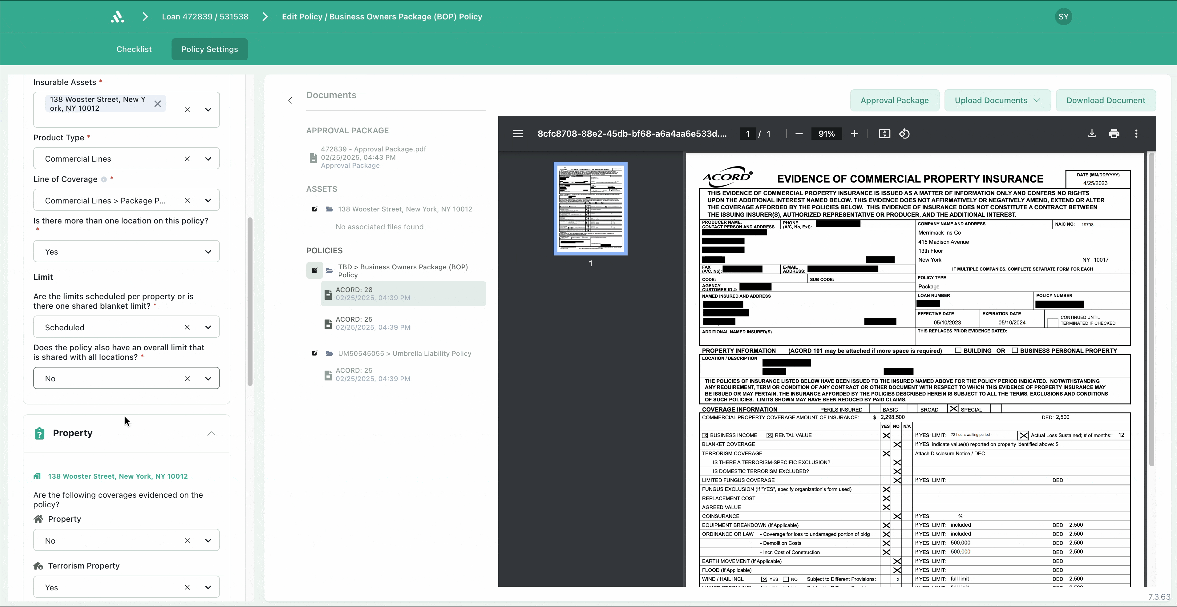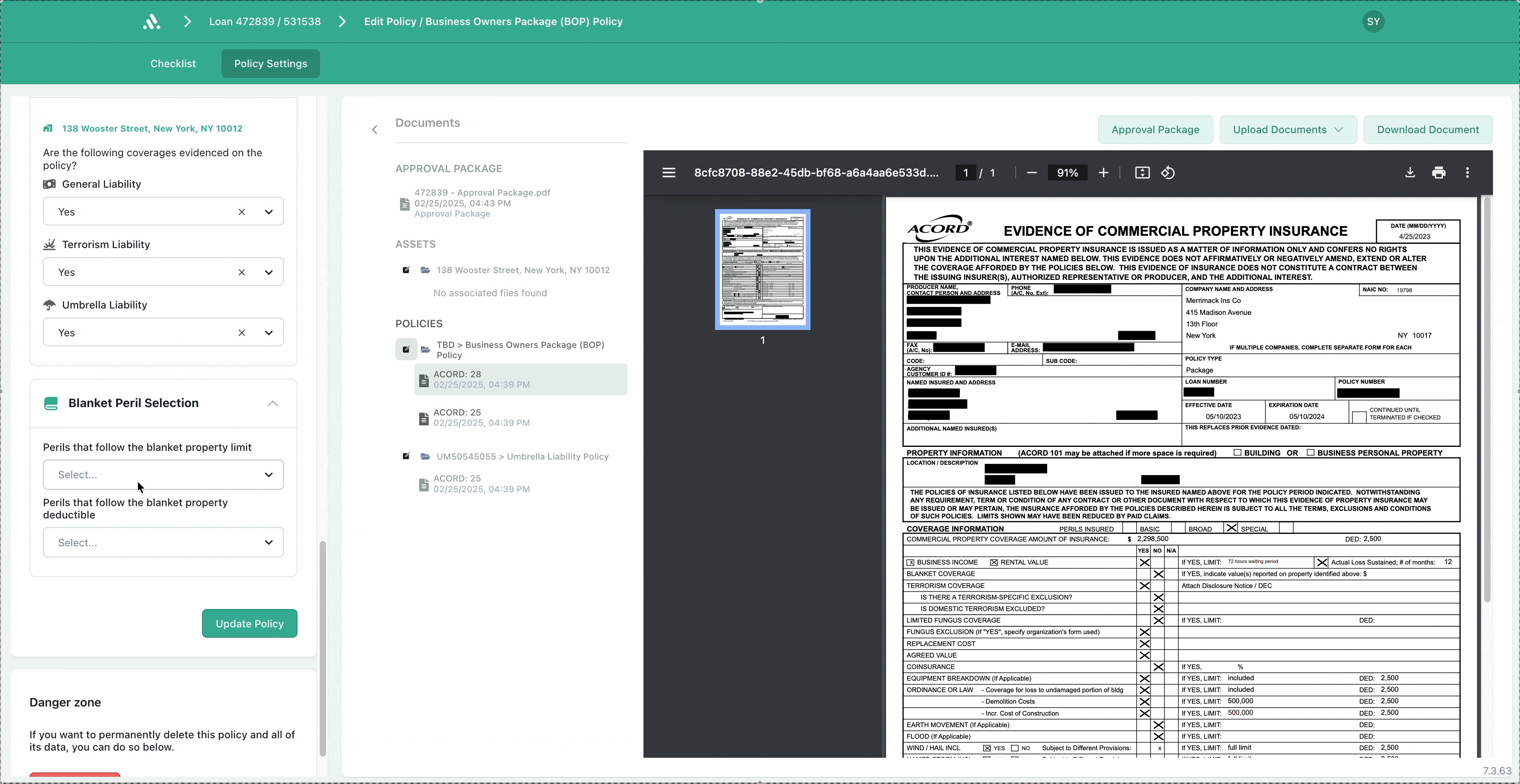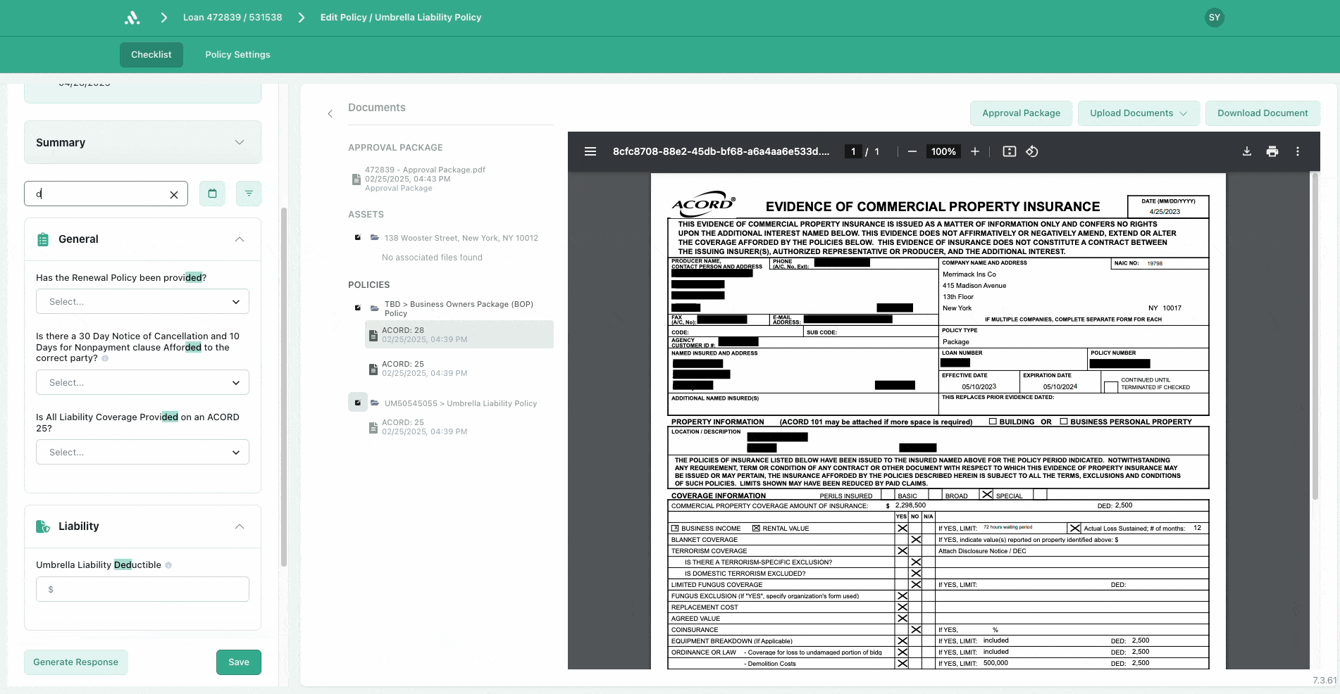 Categorized Fields โ All fields in the review checklist are grouped into General, Property, Blanket, and Liability sections.