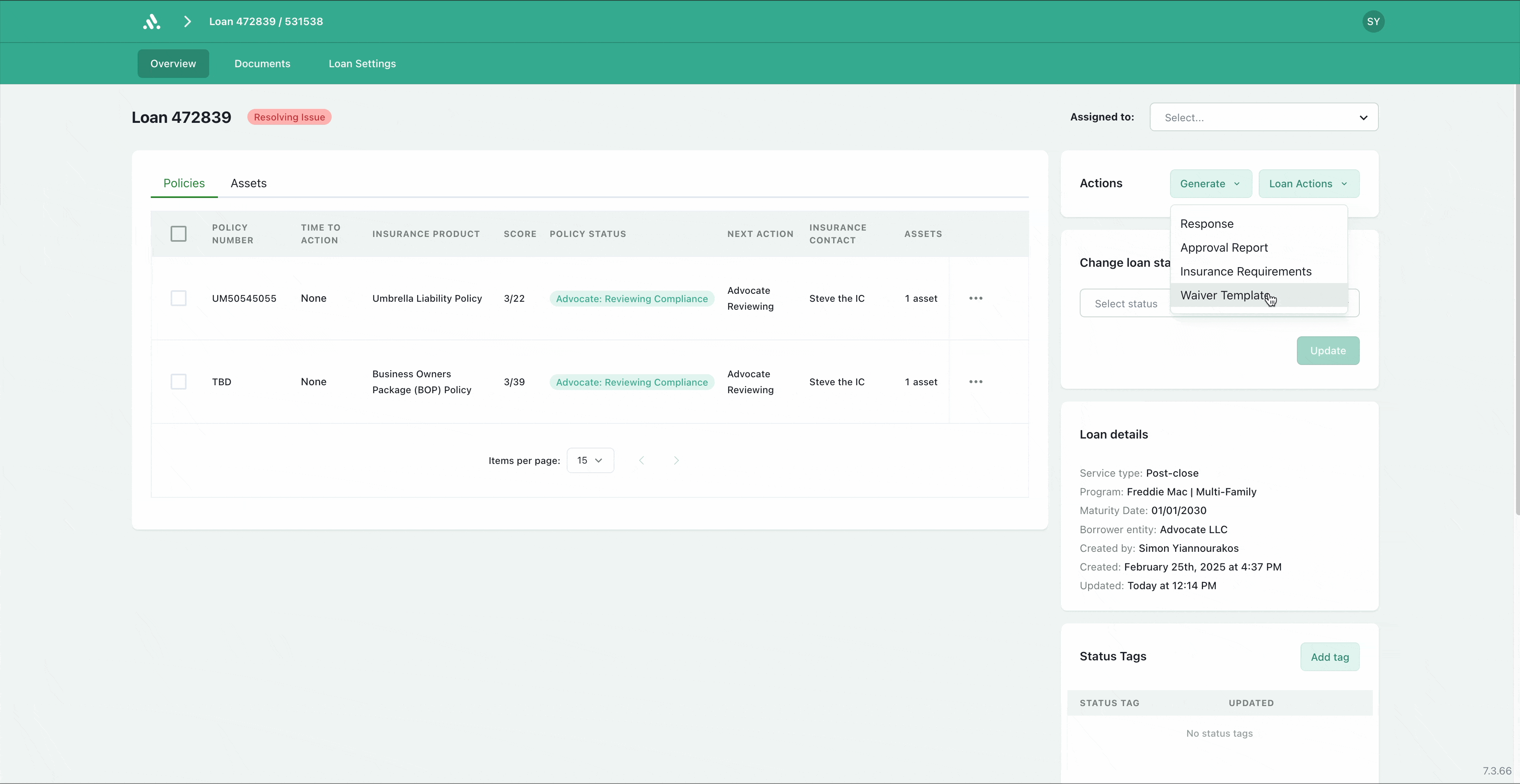 1๏ธโฃ Navigate to the Generate dropdown on any Loan and select "Waiver Template."