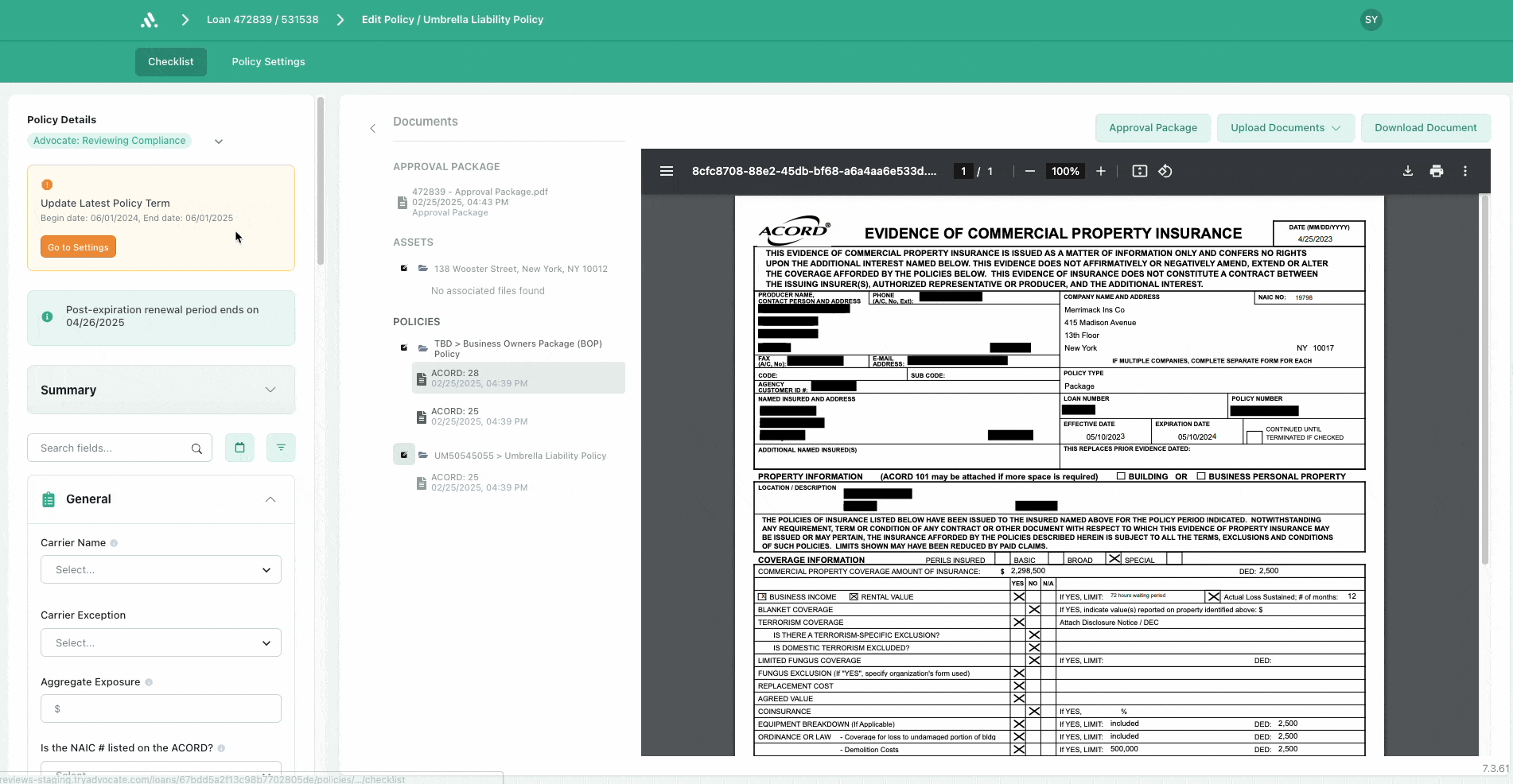 Update Latest Policy Term โ When a new Policy Version is created, the checklist will alert users that the Policy Begin Date and Policy End Date need to be updated to reflect the new term.