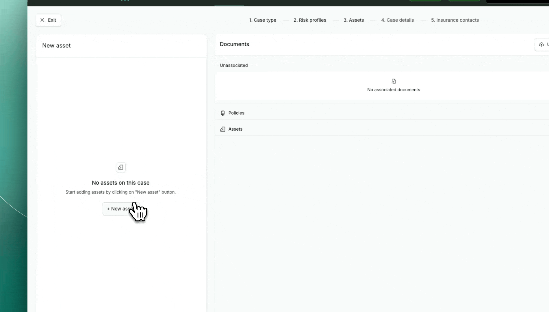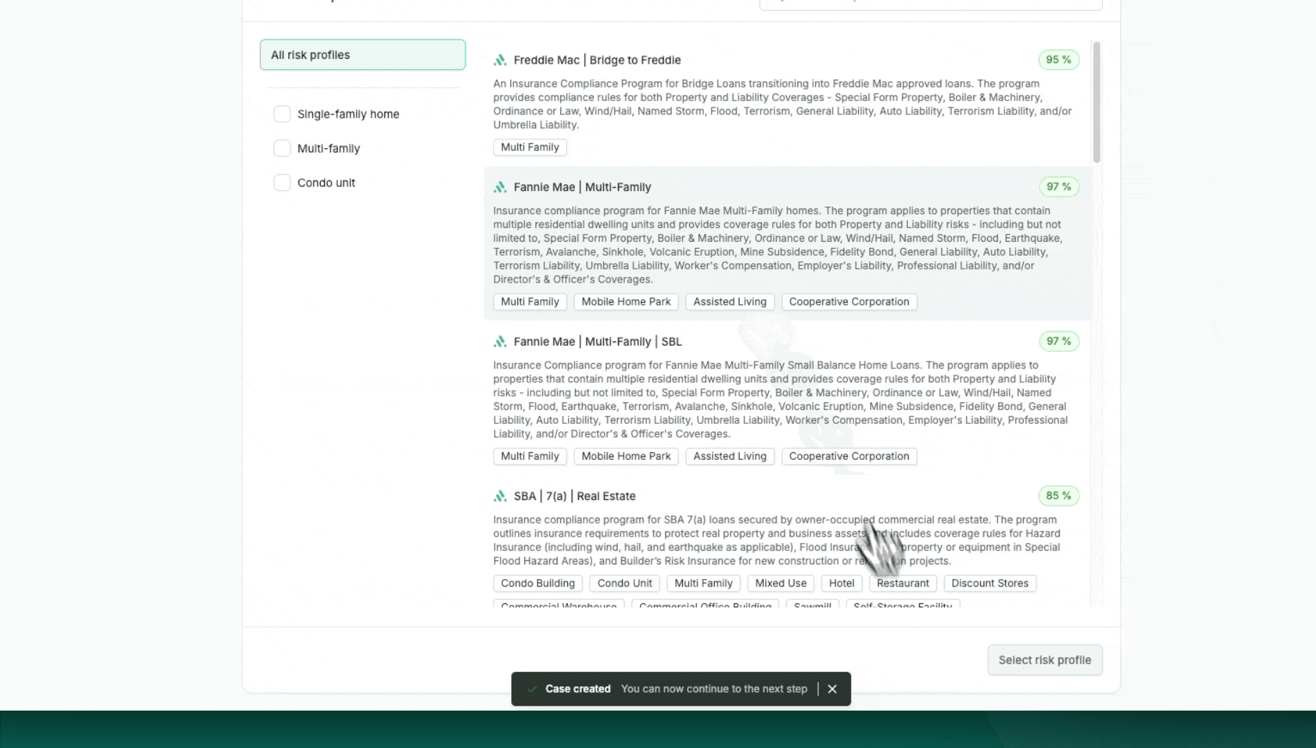 On the left panel, select the insured asset type to filter appropriate risk profiles.