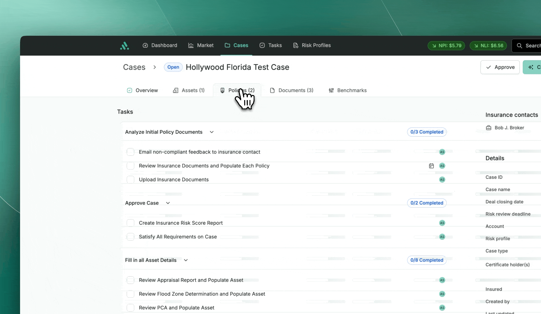 The Assets Tab allows users to view and manage all collateral/assets associated with a Case. It provides a detailed snapshot of each asset’s status, highlighting any missing information and the policies tied to that asset.