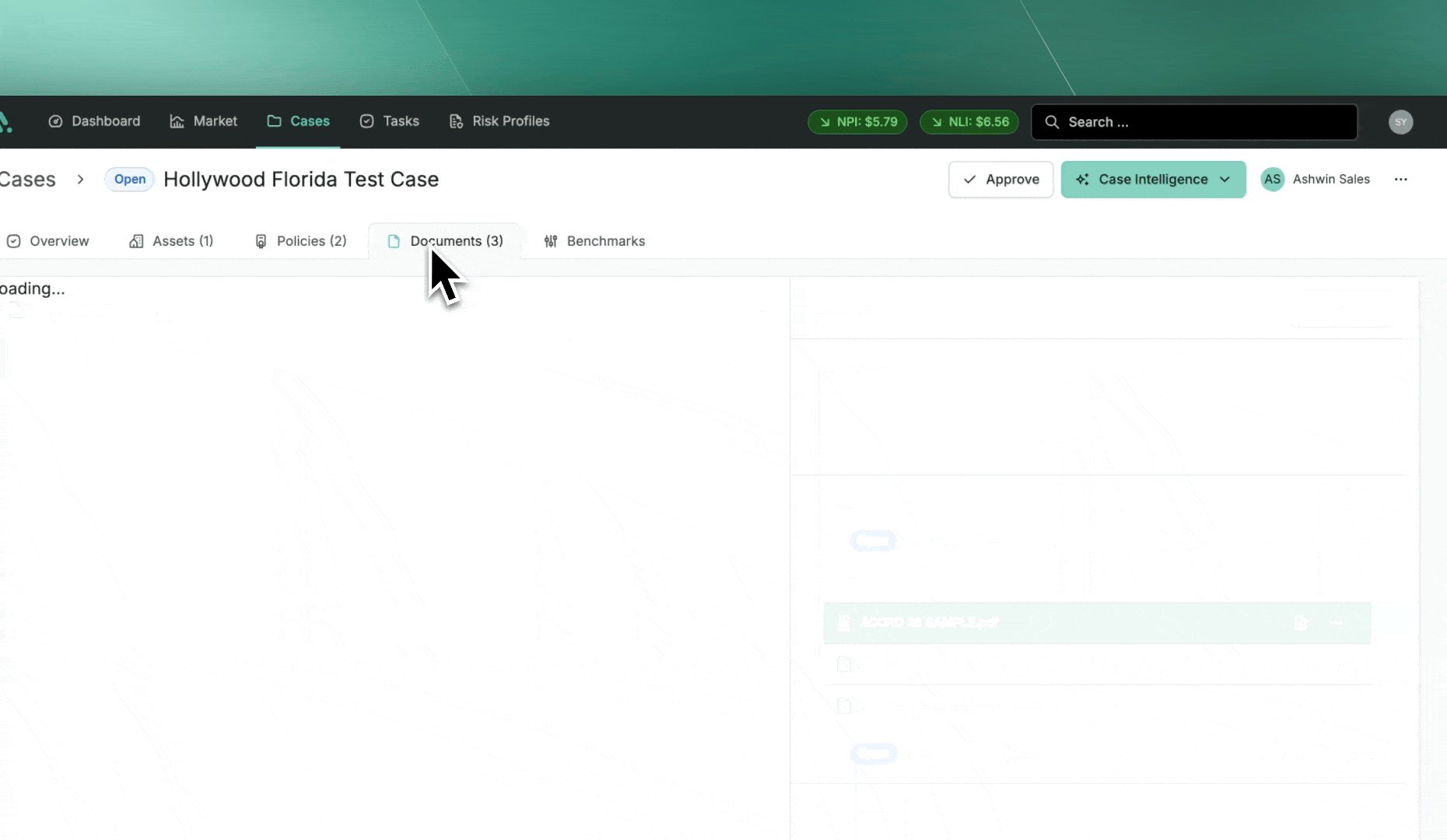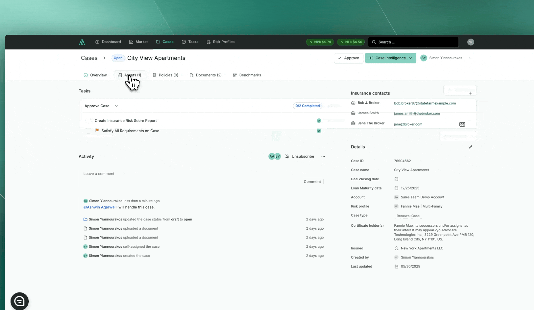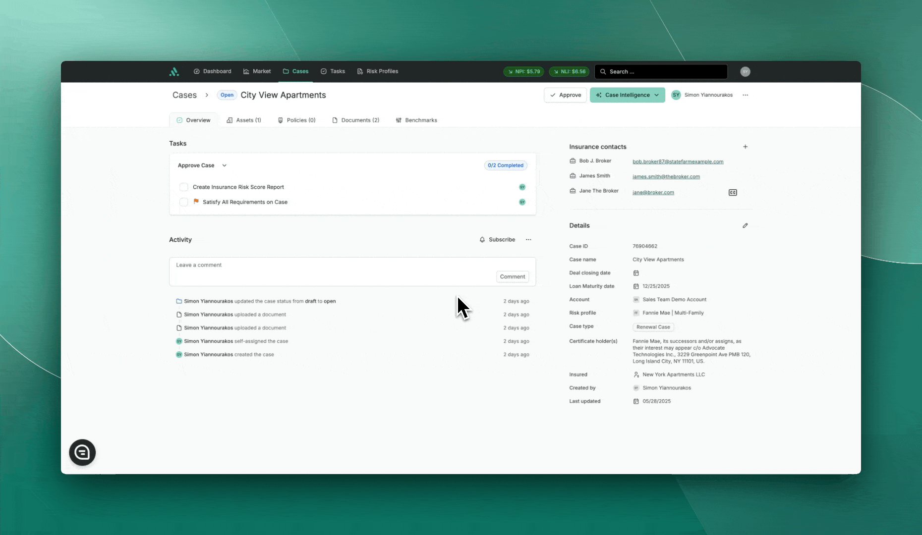 Case Details: Provides a view of key Case data with the ability to show/hide fields and initiate edits. Key fields include: Case ID, Case Name, Insured, Risk Profile, etc.