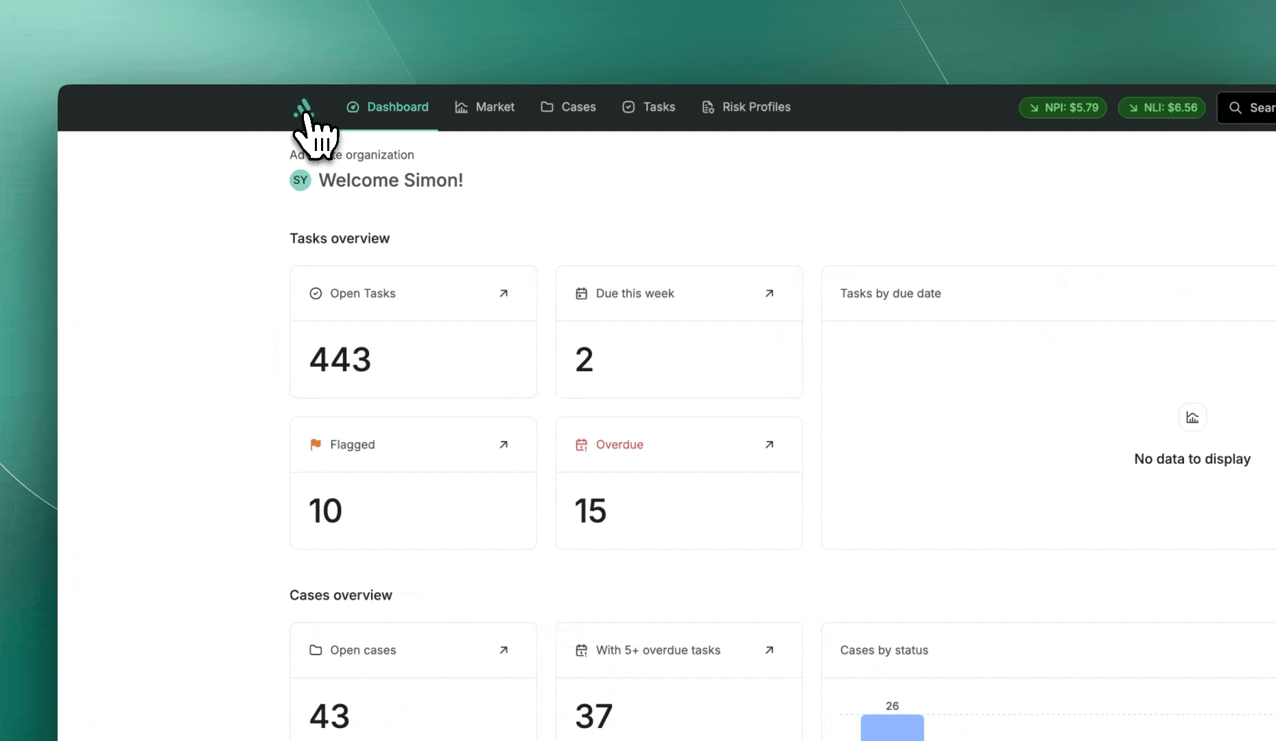 The Case Overview page is the central page for managing all aspects of a loan within Advocate. From here, users can view all case details, participants, case tasks, case activity, manage documents, policies and price benchmarks.