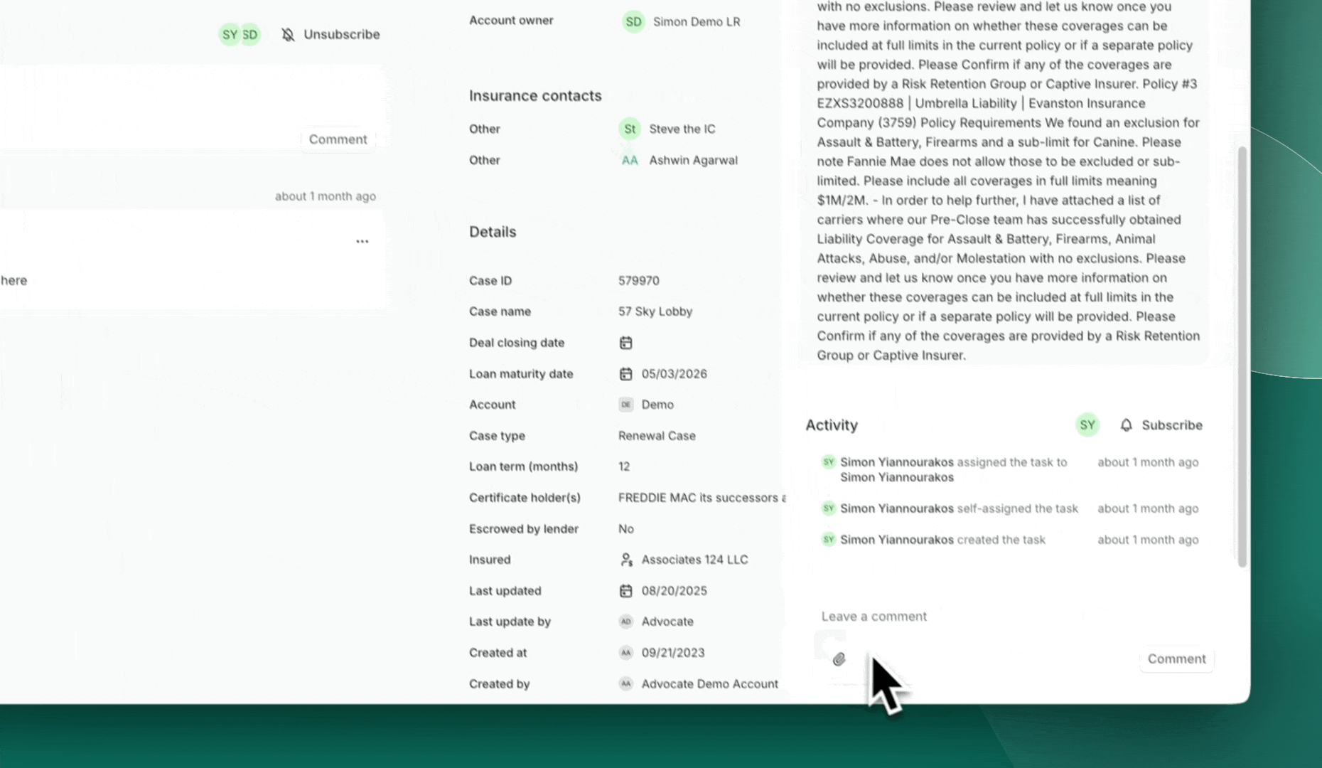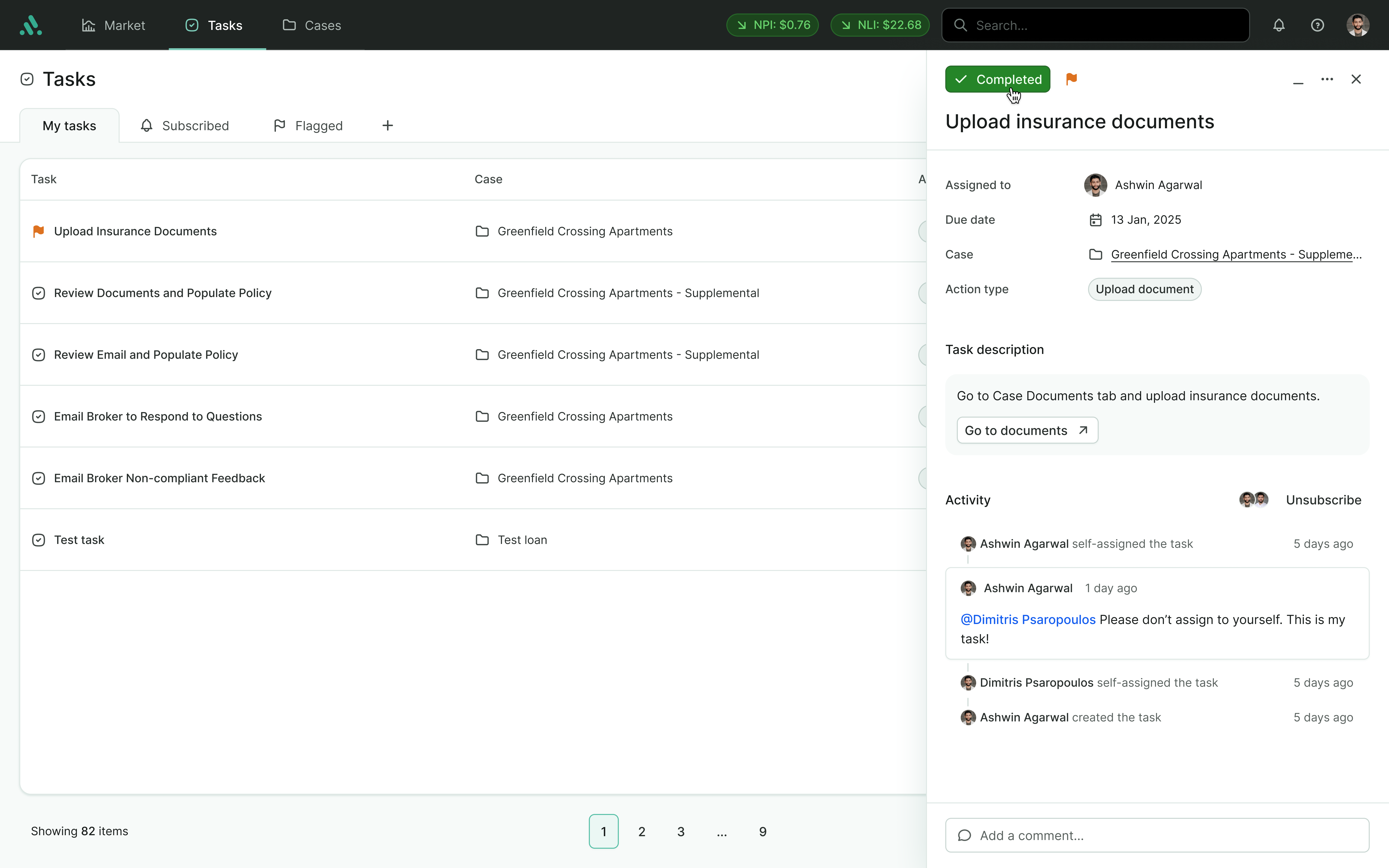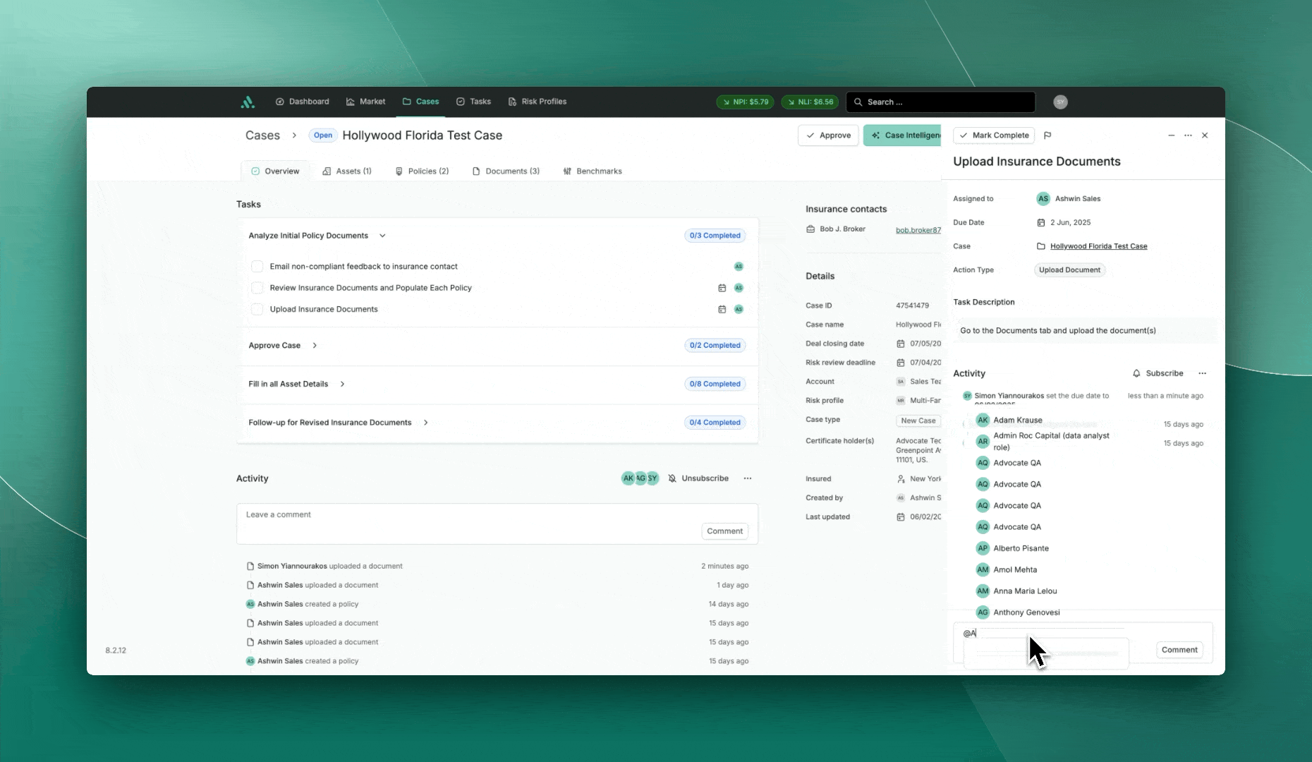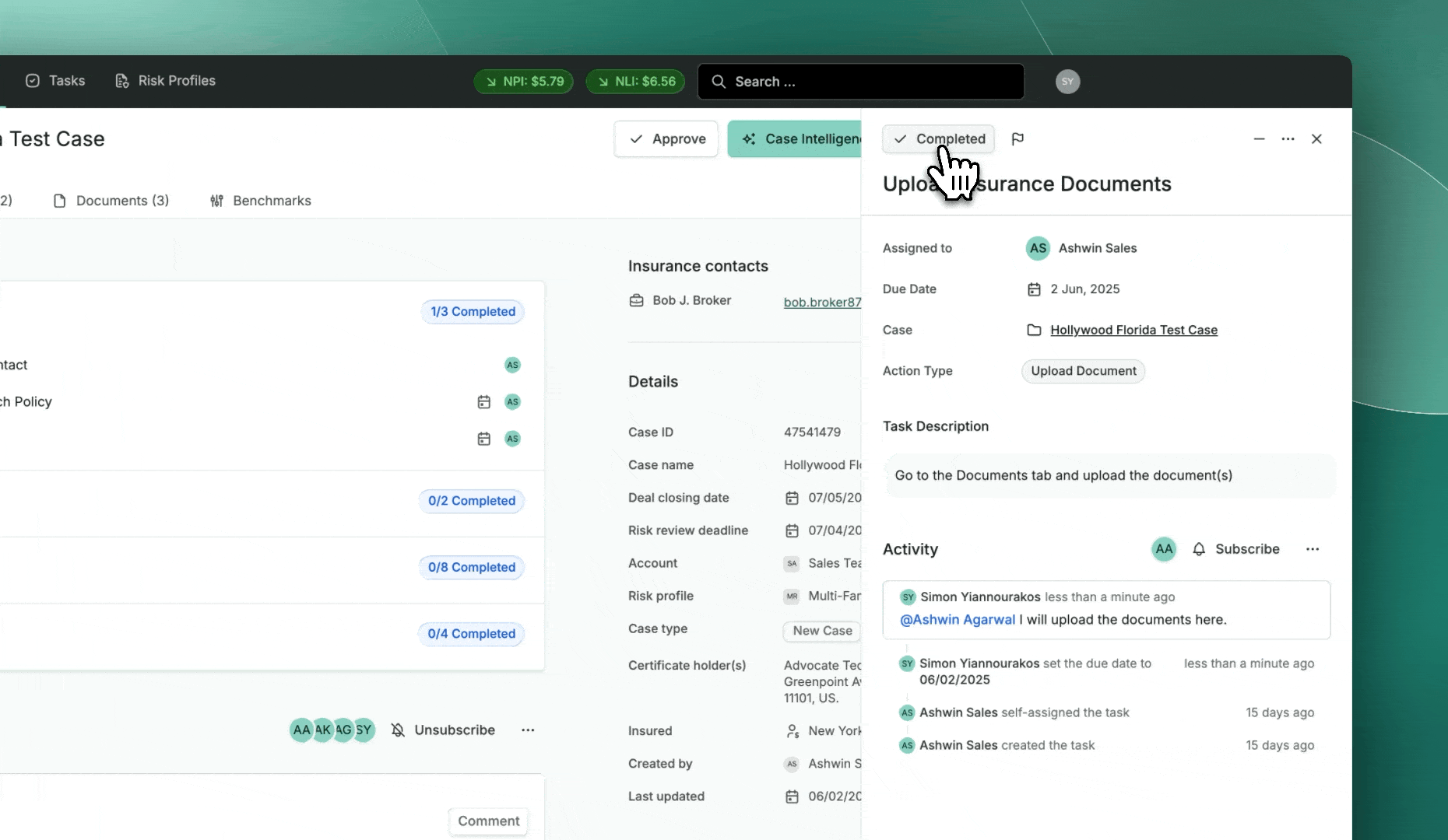 Tasks are action items within a Case that ensure all required steps are completed before a Case can be formally approved. Each Task tracks a specific action, helping teams coordinate and maintain accountability throughout the insurance review and compliance process.