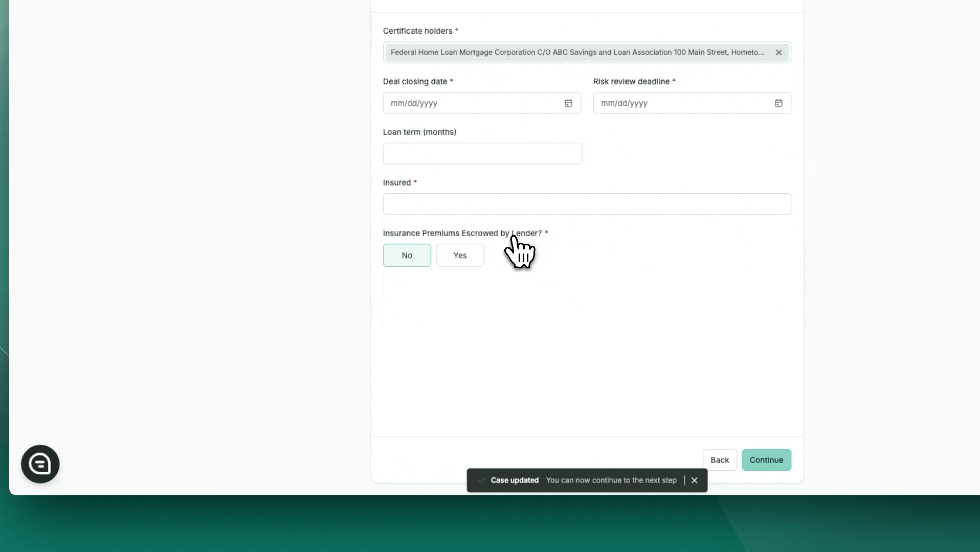Note: This will determine whether relevant tasks to reach out to the Insurance Contact will be initiated, or the user will be able to proceed with an insurance review at submission.