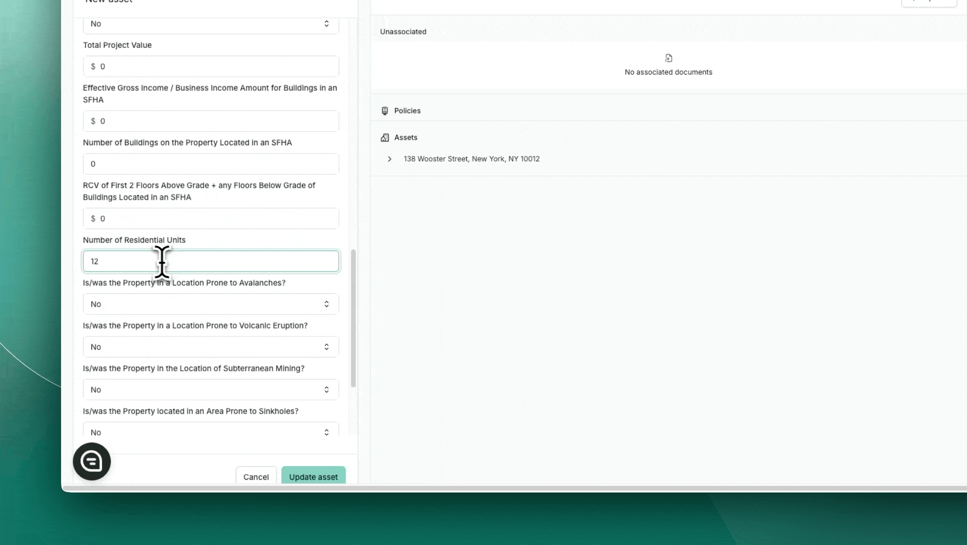 On the left panel, select the insured asset type to filter appropriate risk profiles.