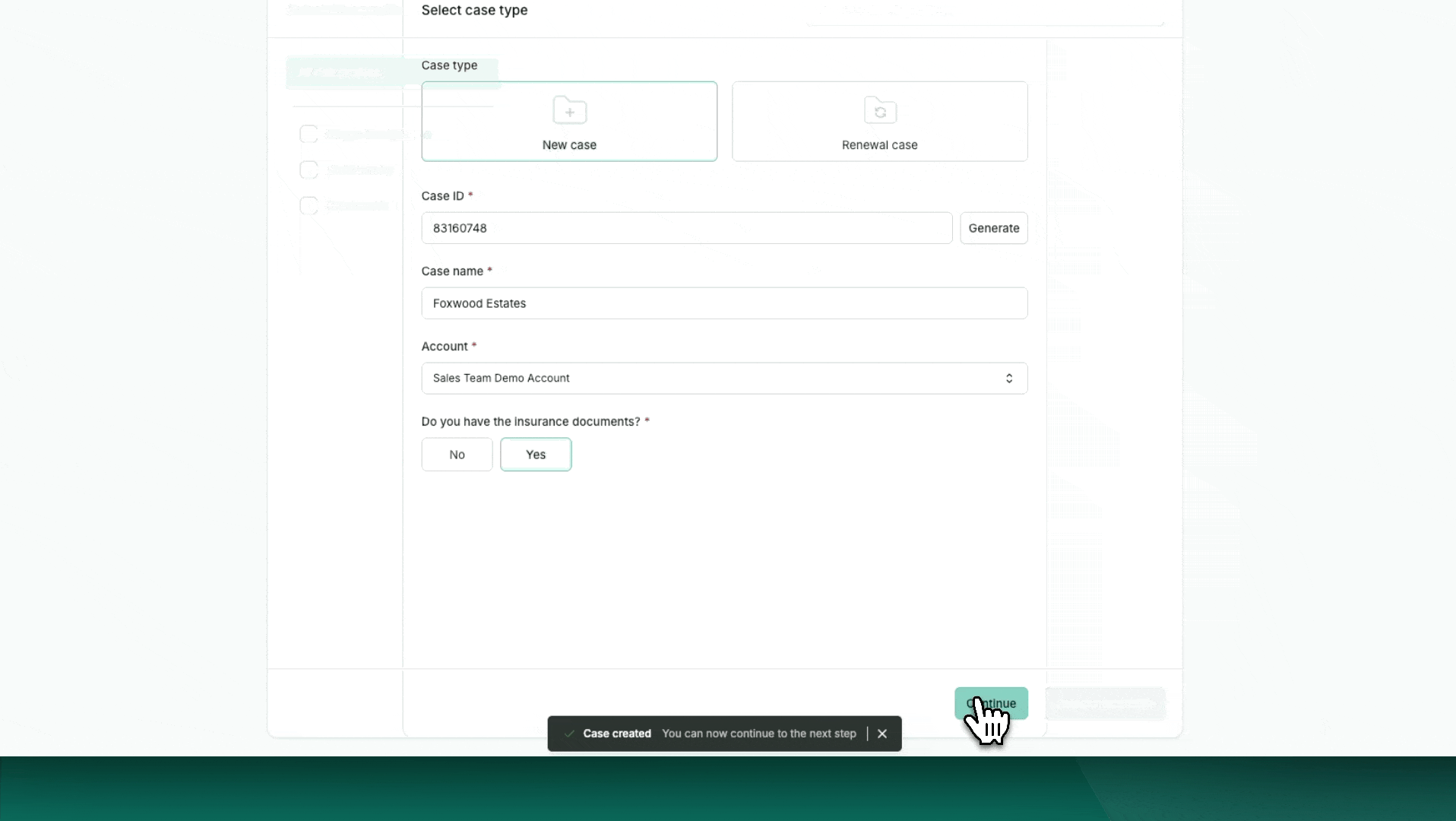 After submission, you'll land on the Case Overview Page. From here, you can view case details and proceed to create a policy.
