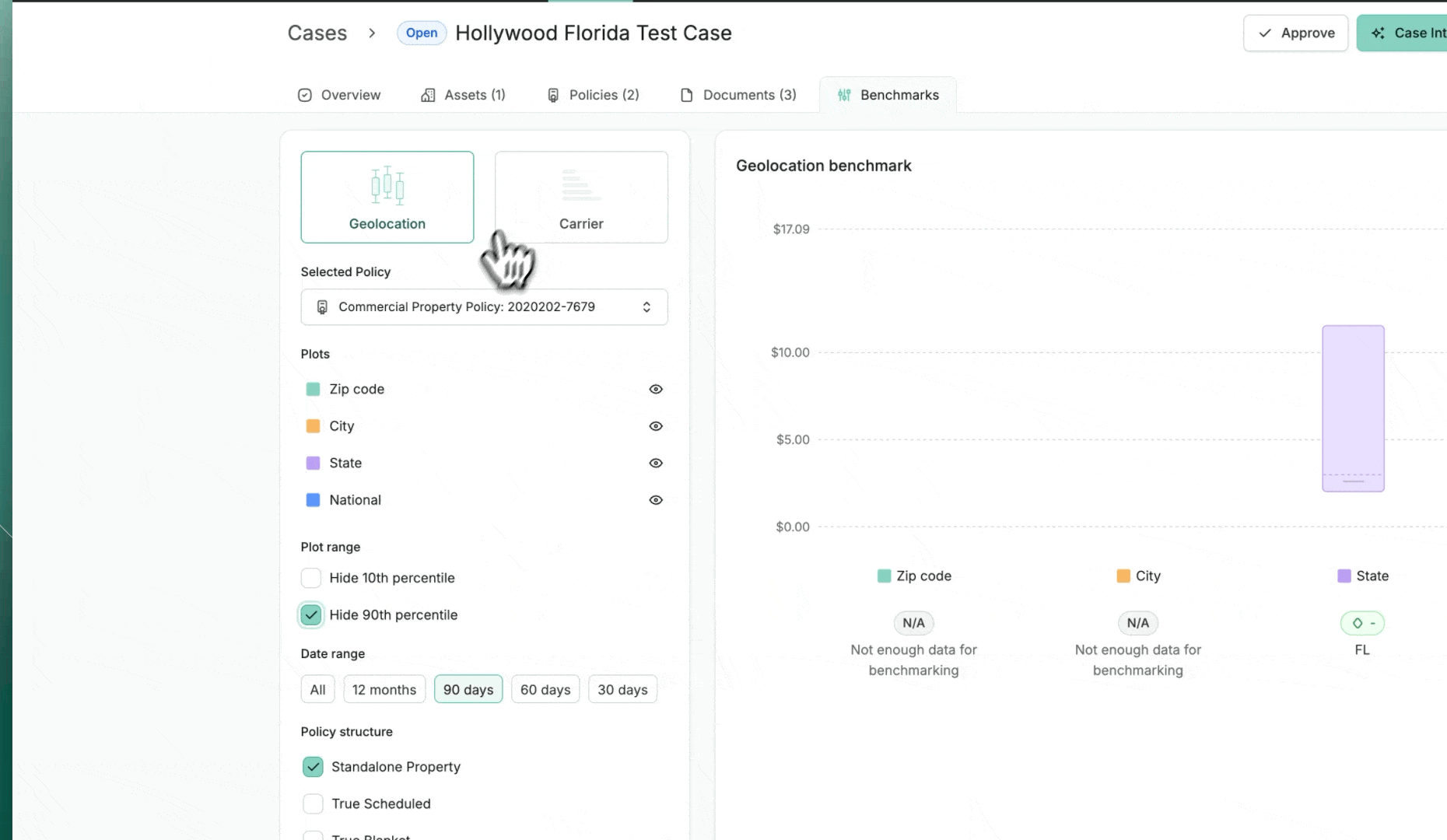 The Benchmarks Tab within a Case provides pricing insights through advanced comparison tools that help users evaluate whether their insurance policies are competitively priced. This functionality leverages Advocate’s national policy data set to provide benchmark visuals and metrics.