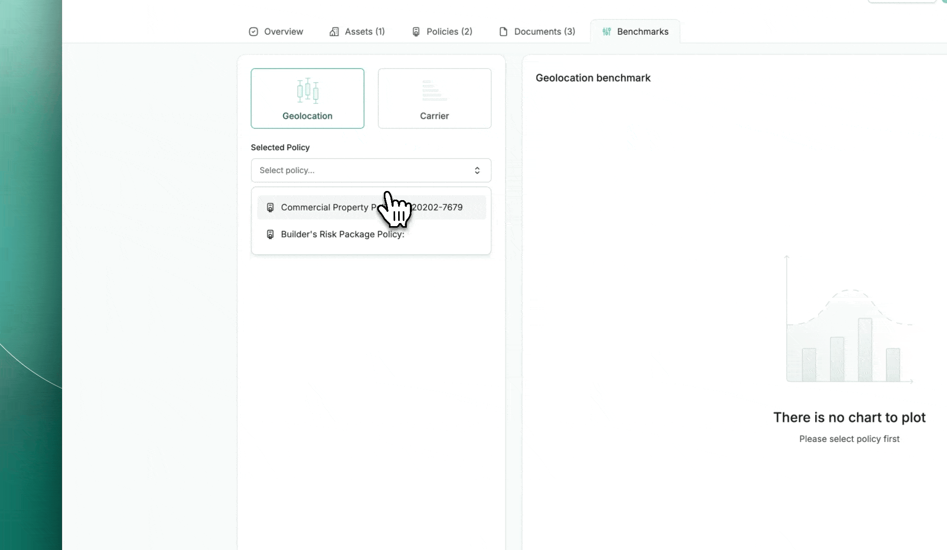 Policy Selector – Users must select a Policy from the Case to generate benchmarks.