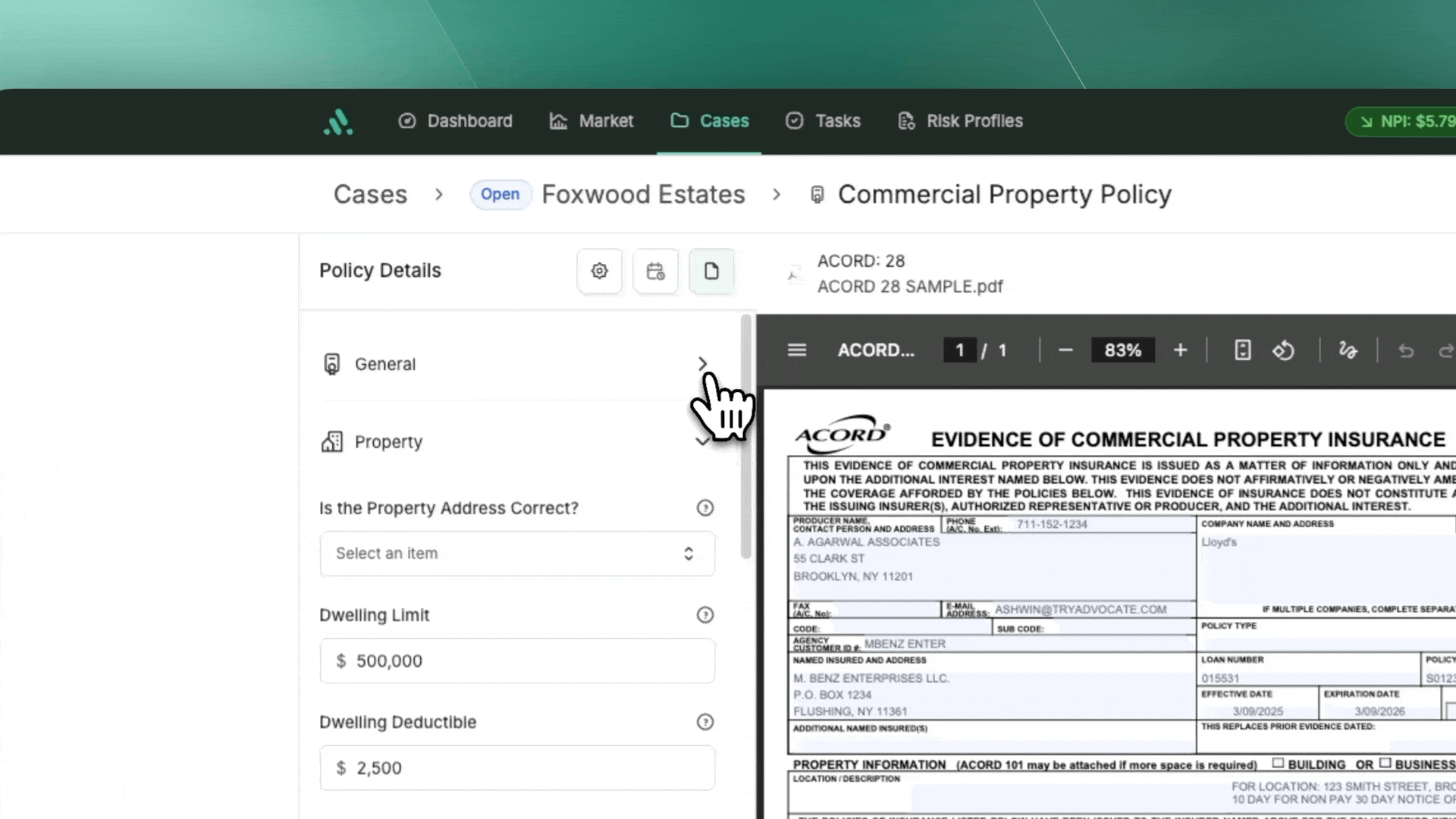 When ready to proceed with a policy review in Advocate, you will need to select the perils or coverages that apply to that policy. The platform’s rule engine helps guide these selections based on risk profile, case details, and asset type. Here’s how it works: