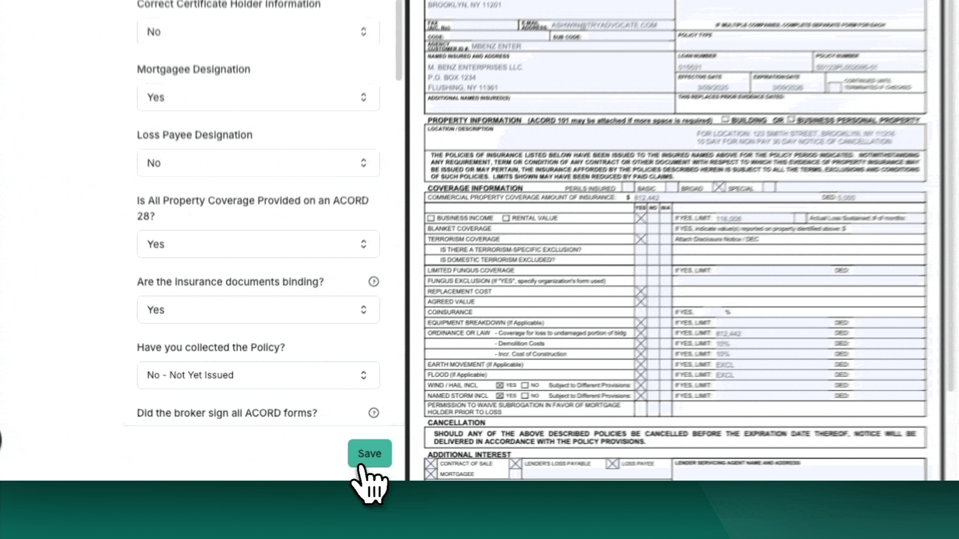 Upon creating the policy, the insurance reviewer examines the actual insurance policy and marks each coverage item based on its presence and relevance. The reviewer can choose from the following options for each coverage: